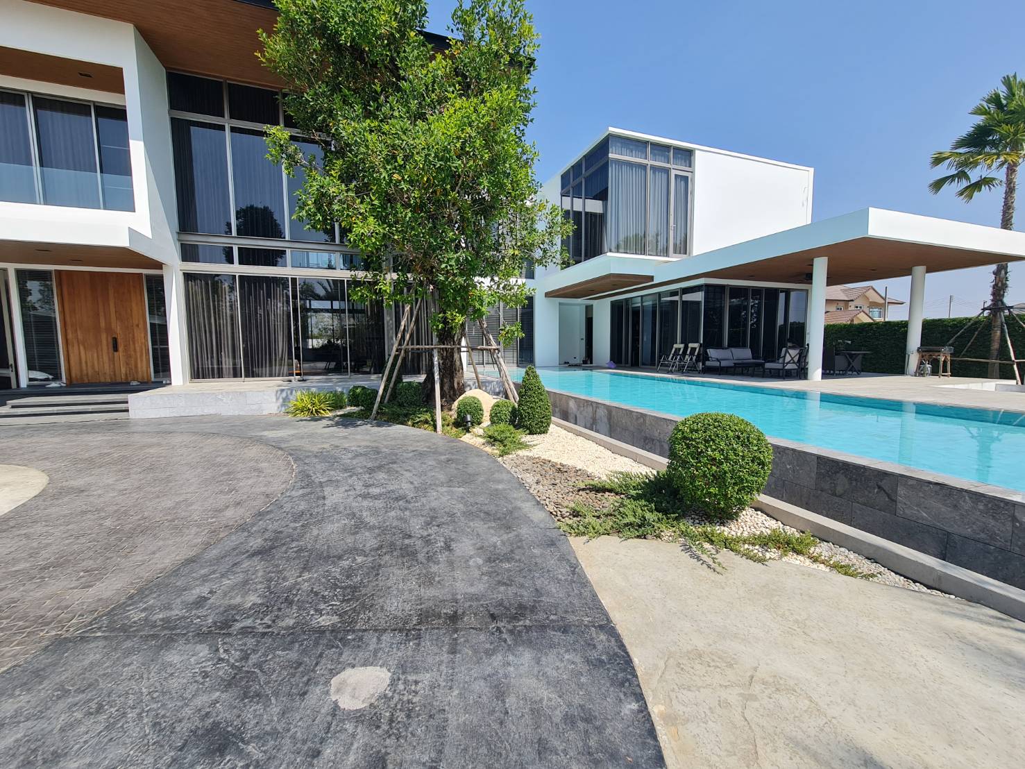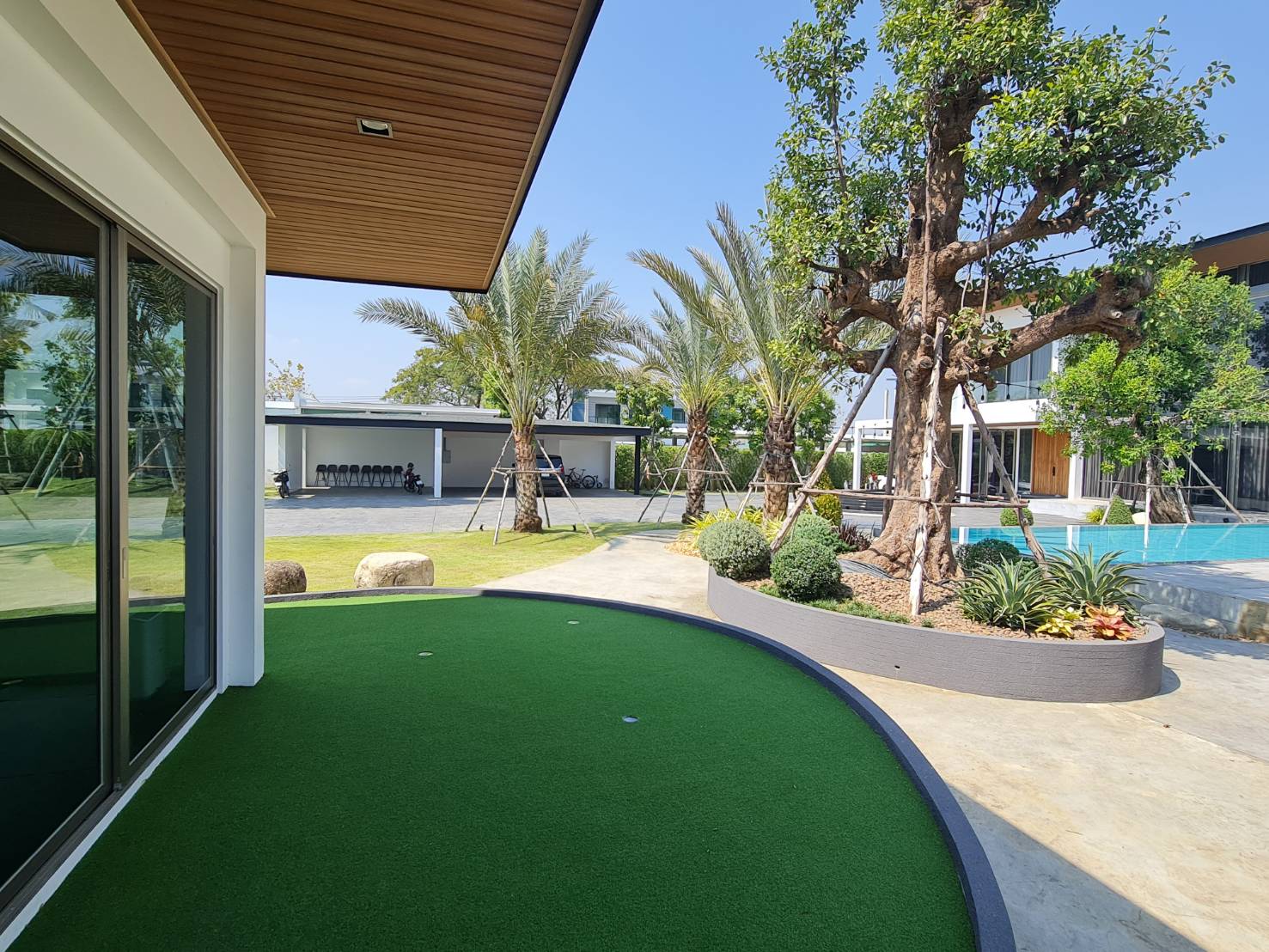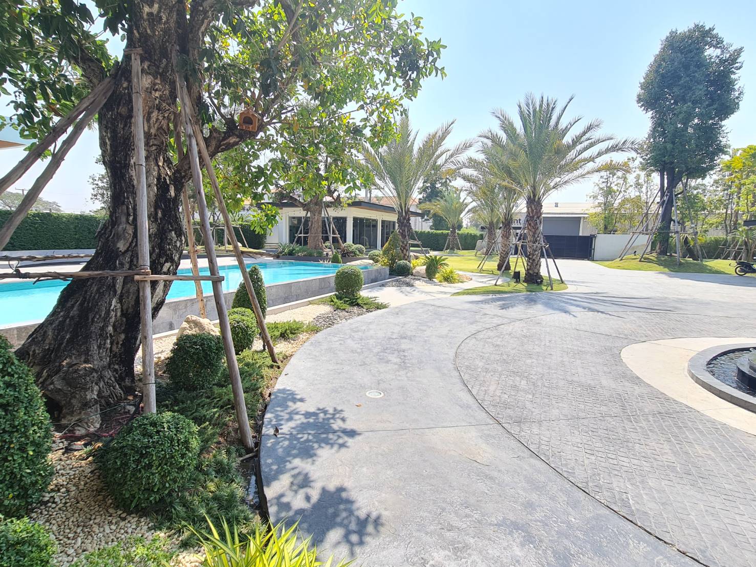 พื้นที่ด้านหน้าบ้านมี ถนนทางเดินคอนกรีตเรียบเท่ ปูอย่างมีจังหวะ ทอดยาวเคียงไปกับแนวไม้พุ่มเตี้ยใบเล็ก เช่น อัญชันเถา, หญ้าแดง, หรือเศรษฐีเรือนนอก ที่ปลูกเป็นแนวขอบ ลดความแข็งของวัสดุด้วยพืชพรรณที่เรียบง่ายแต่ดูมีระเบียบ และถัดไปเพียงไม่กี่ก้าว…คุณจะพบกับ สระว่ายน้ำสีฟ้าใสที่สะท้อนเงาต้นไม้รายรอบ ความเขียวของสนามหญ้าและสีฟ้าของผืนน้ำวางข้างกันอย่างลงตัว ทำให้พื้นที่ตรงนี้กลายเป็นมุมพักผ่อนที่มีชีวิตชีวาโดยไม่ต้องแต่งเติมอะไรให้มากเกิน ไม่ต้องมีน้ำตก ไม่ต้องมีดอกไม้สีฉูดฉาด แต่กลับรู้สึกเย็นสบายตั้งแต่ก้าวแรกที่เดินเข้ามา เพราะนี่คือสวนที่ออกแบบมาเพื่อ “อยู่ร่วมกับบ้านและแสงแดด” อย่างสงบและกลมกลืน