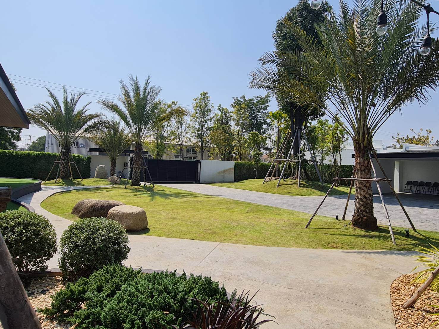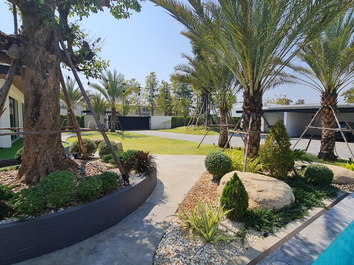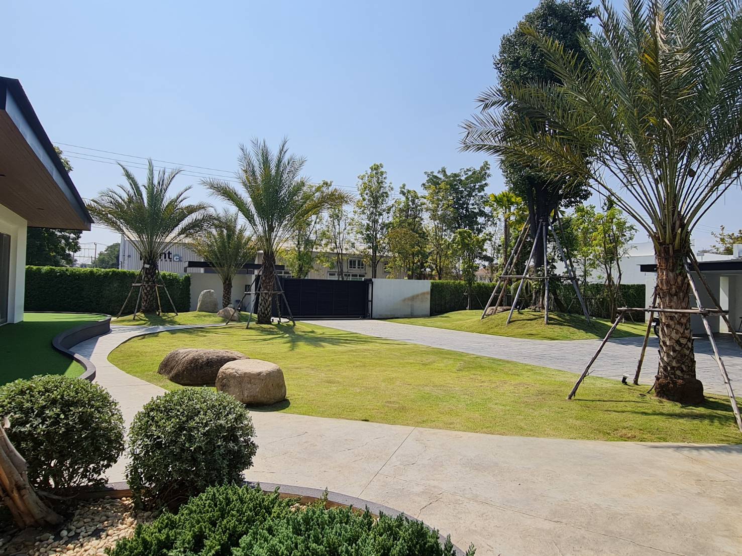 สวนที่ออกแบบมาเพื่อตอบรับกับไลฟ์สไตล์ของคนรักแสงแดด รักความโปร่งโล่ง แต่ก็ยังต้องการพื้นที่สีเขียวที่มีชีวิต ตัวสวนถูกออกแบบให้หายใจได้อย่างเป็นธรรมชาติ ไม่มีพุ่มรก ไม่มีความยุ่งเหยิง มีเพียงเส้นสายของไม้ใบเรียวสวย ที่เรียงตัวอย่างตั้งใจบนแผ่นผืนหญ้าที่เขียวสดและดูสะอาดตา ต้นไม้หลักเป็นไม้ทนแดด ฟอร์มชัด เช่น ต้นปาล์ม, ปรง, หมากแดง หรือกระพี้จั่น ปลูกแทรกไว้เป็นจังหวะ สร้างจุดนำสายตา และให้ร่มเงาแบบโปร่ง ๆ ไม่ทึบตัน แต่พอให้แสงแดดลอดผ่านเป็นลวดลายแสงเงาที่ทอดลงบนพื้นสนามหญ้าเขียว ๆ อย่างละมุน