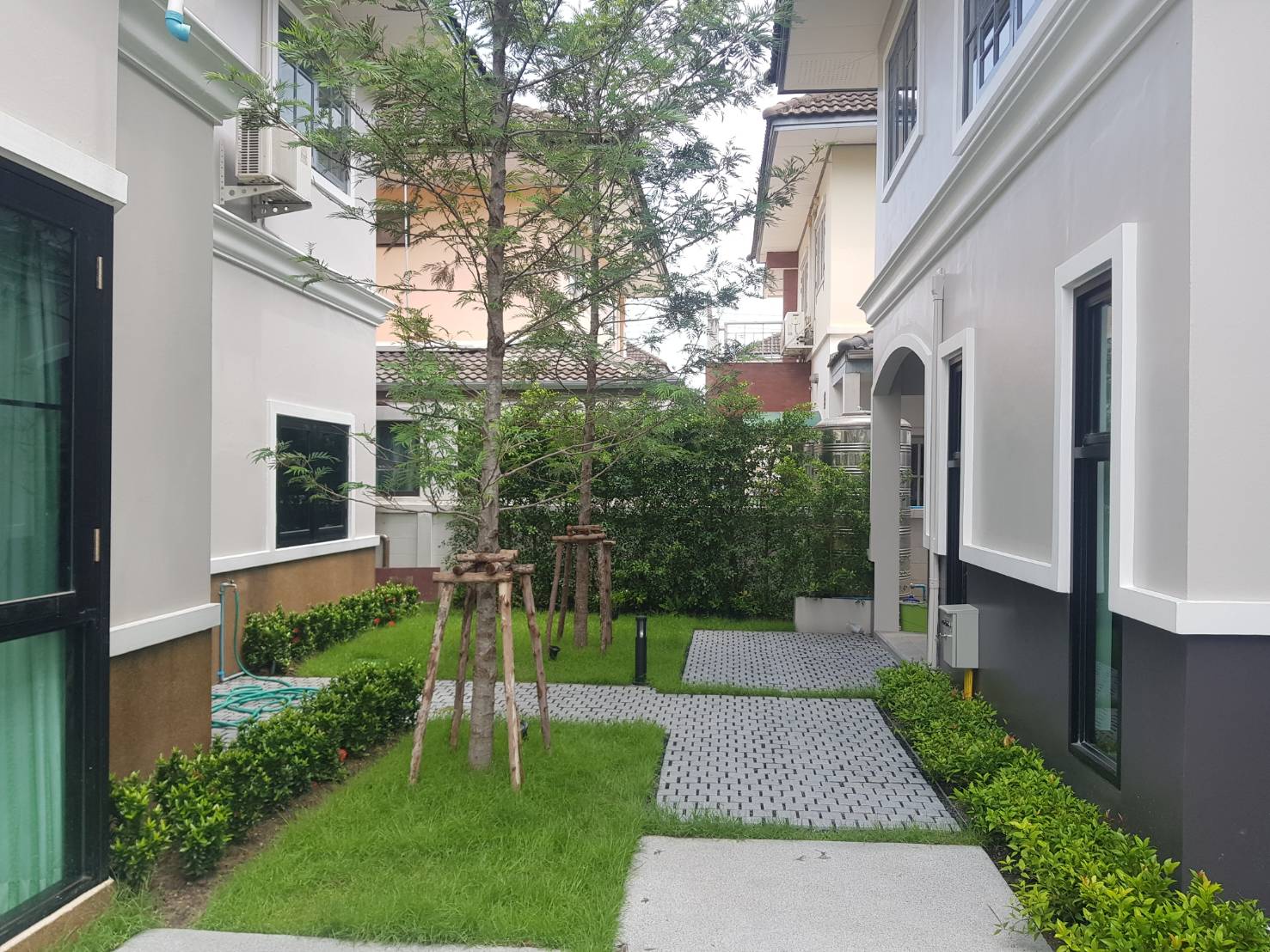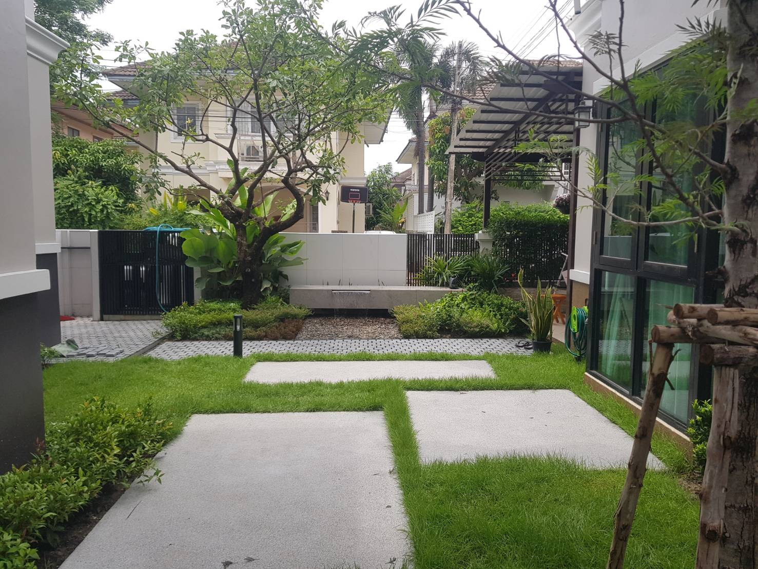 การออกแบบสวนหลังบ้านหลังนี้เน้นความเป็นระเบียบและใช้พื้นที่ได้อย่างคุ้มค่า ด้วยทางเดินแผ่นปูนทรงเรขาคณิตตัดกับสนามหญ้าสีเขียวสด ช่วยเพิ่มมิติให้สวนดูมีลูกเล่นและน่าสนใจยิ่งขึ้น ต้นไม้ขนาดกลางถูกจัดวางอย่างมีจังหวะ เพื่อสร้างร่มเงาและความเป็นธรรมชาติ โดยไม่บดบังทัศนียภาพของบ้าน พืชพุ่มเตี้ยริมทางเดินและพื้นที่มุมรั้วช่วยเติมความเขียวขจีอย่างพอดี ทำให้สวนดูไม่โล่งเกินไป แต่ยังคงความเรียบง่ายแบบมินิมอล เหมาะมากสำหรับบ้านในเมืองที่ต้องการพื้นที่พักผ่อนสงบ ๆ พร้อมบรรยากาศธรรมชาติที่ลงตัว
