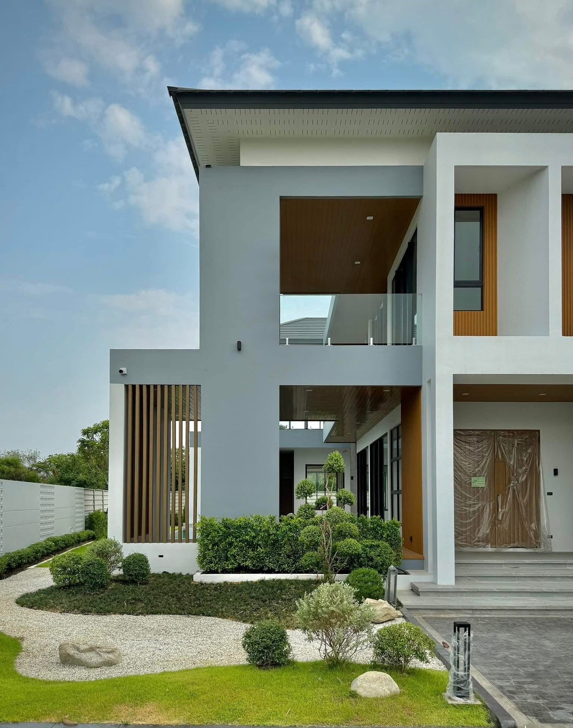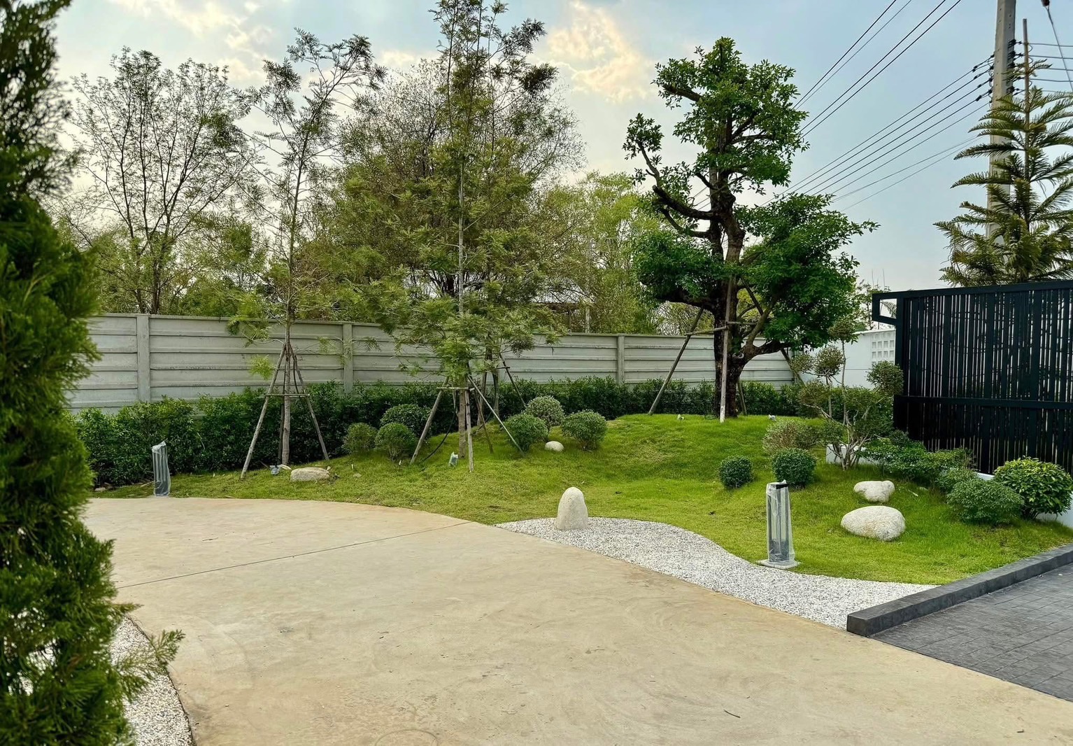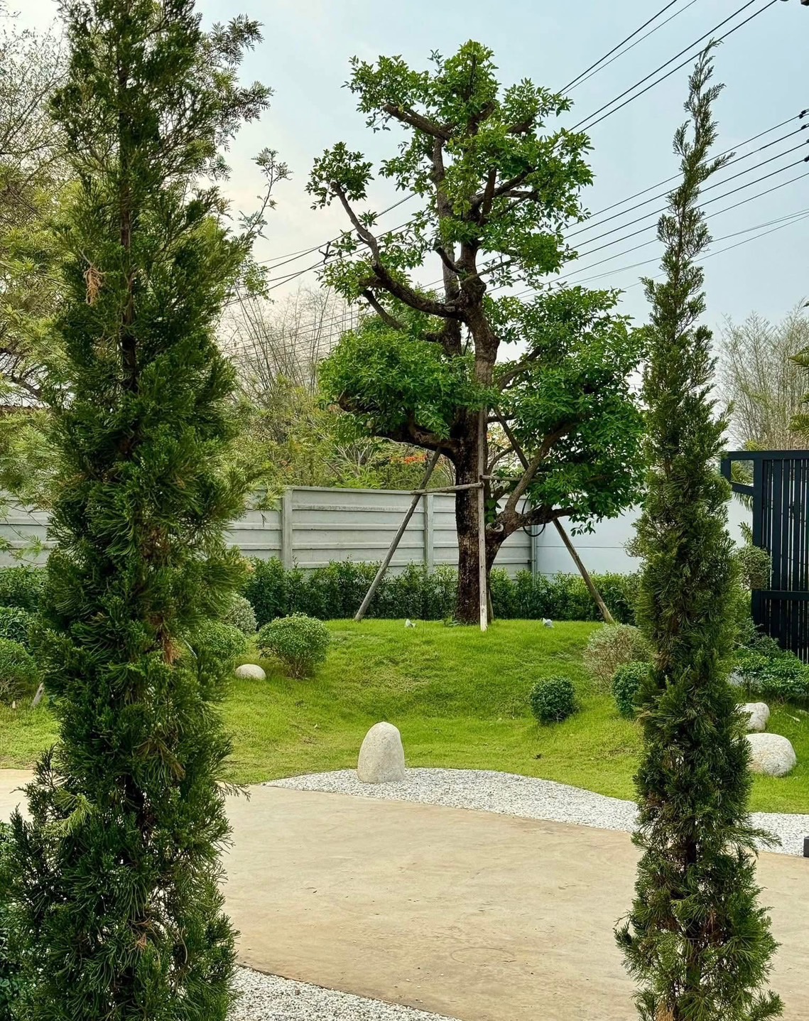สวนนี้ออกแบบภายใต้แนวคิด “น้อยแต่มาก” ที่ผสานความเรียบเท่ของสวนโมเดิร์นเข้ากับบรรยากาศสงบแบบสวนญี่ปุ่นได้อย่างลงตัว ด้วยการจัดวางต้นไม้ไม่หนาแน่นเกินไป แต่เลือกใช้พันธุ์ไม้ที่มีฟอร์มสวย เช่นไม้ใบเรียบ ลำต้นชัดเจน และมีพื้นที่เปิดโล่งให้หายใจ ดูแลรักษาง่าย ไม่รก ไม่ซับซ้อน เหมาะกับไลฟ์สไตล์คนยุคใหม่ ทางเดินพื้นคอนกรีตพิมพ์ลาย ช่วยนำสายตาเข้าสู่มุมพักผ่อนของสวน ซึ่งถูกโอบล้อมด้วยสีเขียวอย่างพอดี ผสานกับองค์ประกอบของต้นไม้ใหญ่ที่ให้ร่มเงา และไม้พุ่มเตี้ยที่จัดอย่างเป็นระเบียบ