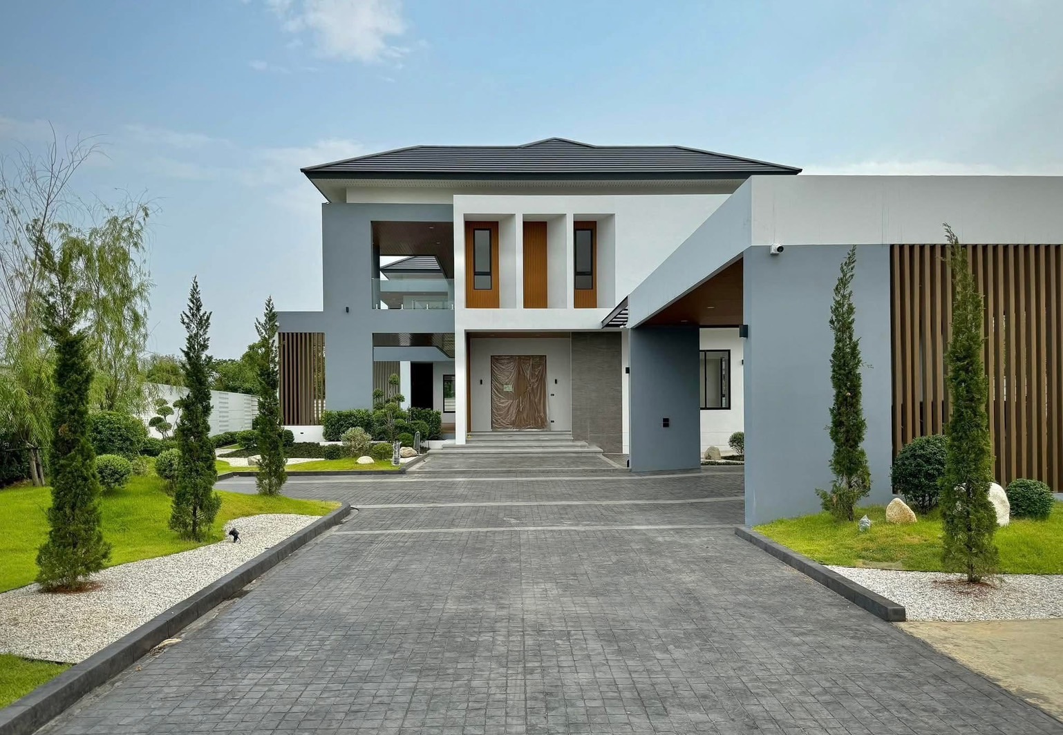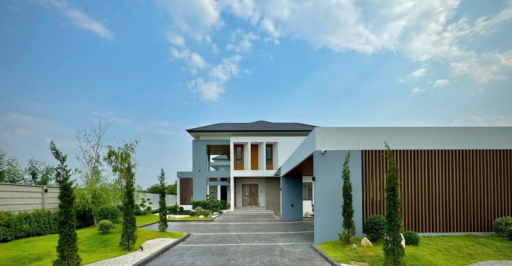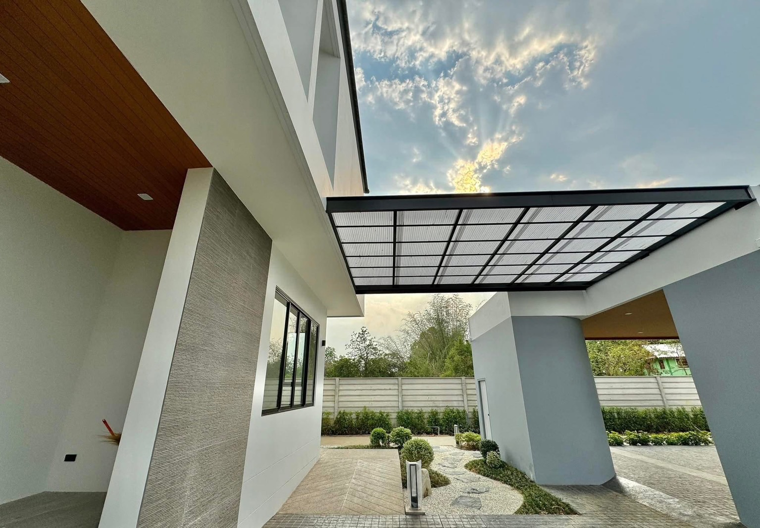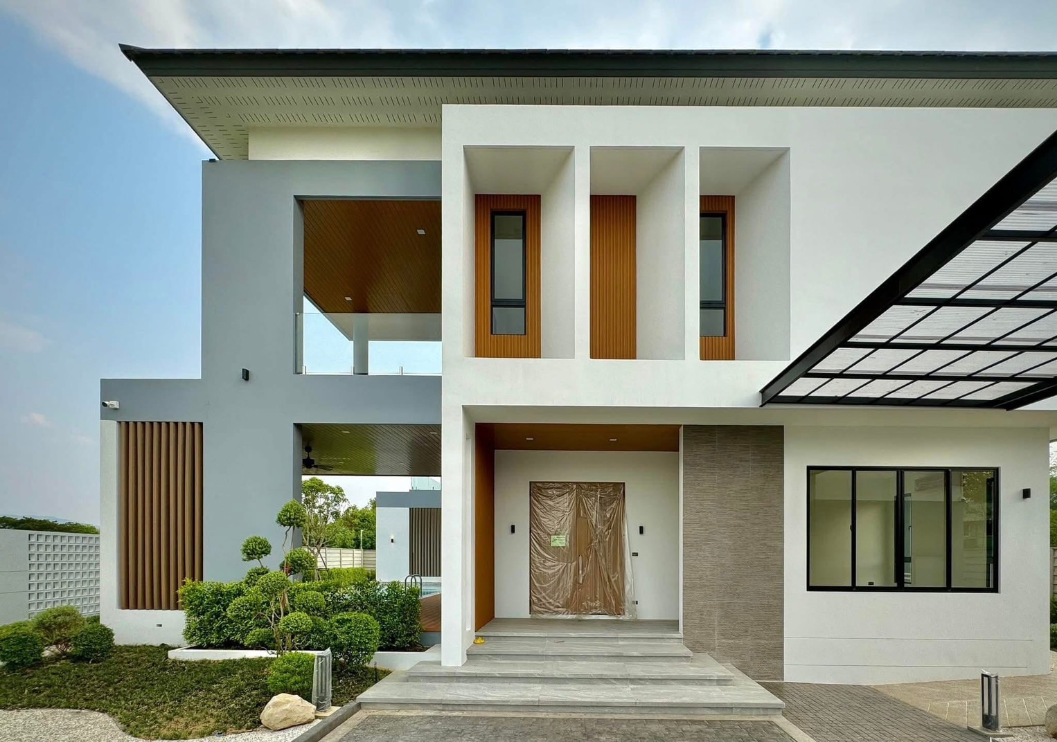 สวนนี้ออกแบบภายใต้แนวคิด “น้อยแต่มาก” ที่ผสานความเรียบเท่ของสวนโมเดิร์นเข้ากับบรรยากาศสงบแบบสวนญี่ปุ่นได้อย่างลงตัว ด้วยการจัดวางต้นไม้ไม่หนาแน่นเกินไป แต่เลือกใช้พันธุ์ไม้ที่มีฟอร์มสวย เช่นไม้ใบเรียบ ลำต้นชัดเจน และมีพื้นที่เปิดโล่งให้หายใจ ดูแลรักษาง่าย ไม่รก ไม่ซับซ้อน เหมาะกับไลฟ์สไตล์คนยุคใหม่ ทางเดินพื้นคอนกรีตพิมพ์ลาย ช่วยนำสายตาเข้าสู่มุมพักผ่อนของสวน ซึ่งถูกโอบล้อมด้วยสีเขียวอย่างพอดี ผสานกับองค์ประกอบของต้นไม้ใหญ่ที่ให้ร่มเงา และไม้พุ่มเตี้ยที่จัดอย่างเป็นระเบียบ